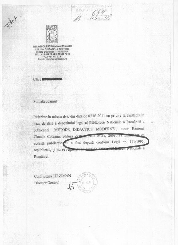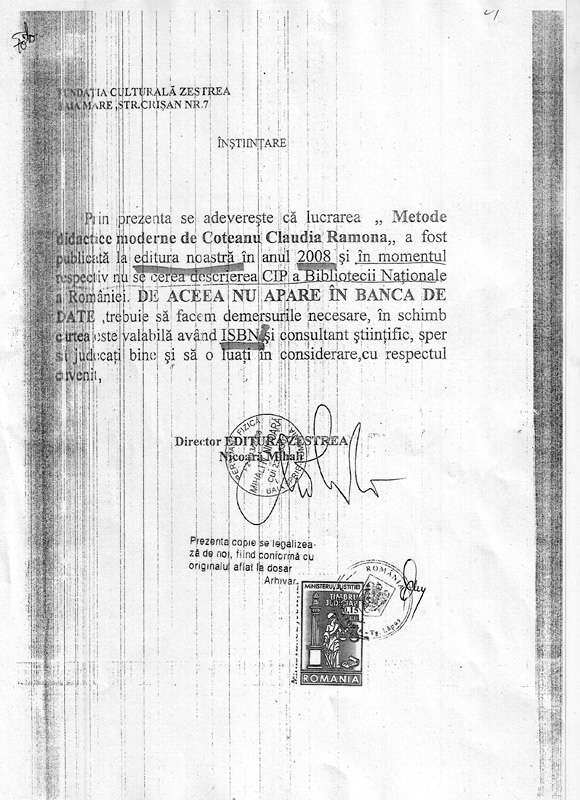 Acest lucru a fost posibil datorită cărţii lui Coteanu Ramona care, după ce lucrarea i-a fost luată în considerare la examenul de grad din 10 februarie 2011, speriată de scandalul iscat ulterior acestei date, îşi înregistrează în aprilie 2011 la Biblioteca Naţională lucrarea ”Metode Didactice Moderne” tipărită de ”Editura Zestrea” care de altfel călătoreşte şi aceasta în timp, deoarece cu toate că nu era autorizată la data anchetei procuraturii să tipărească carte, totuşi doamna prim-procuror a luat în considerare faptul că, editura se va autoriza în viitor, dând astfel NUP în cazul dosarului lui Coteanu Claudia Ramona, acuzată de fals şi uz de fals.