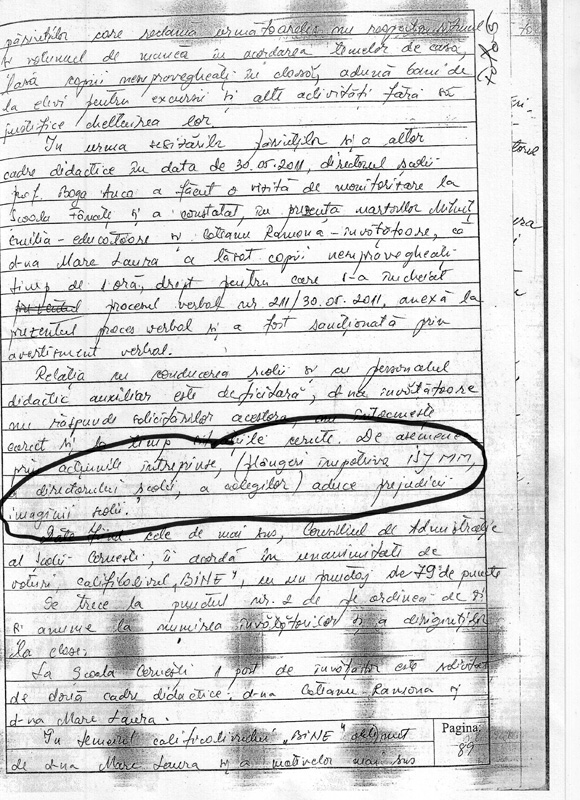 Astfel că, în cadrul evaluării făcute învăţătorilor, cei din comisia de evaluare nu doar că i-au dat un calificativ mai slab învăţătoarei care şi-a permis să arate ilegalităţile din sistem, dar mai mult, au avut tupeul să şi specifice în procesul verbal criteriile care au stat la baza acestei evaluări, cităm ”... prin acţiunile intreprinse, (plângeri împotriva ISJ MM, a directoarei şcolii, a colegilor) aduce prejudicii imaginii şcolii”(foto 5).