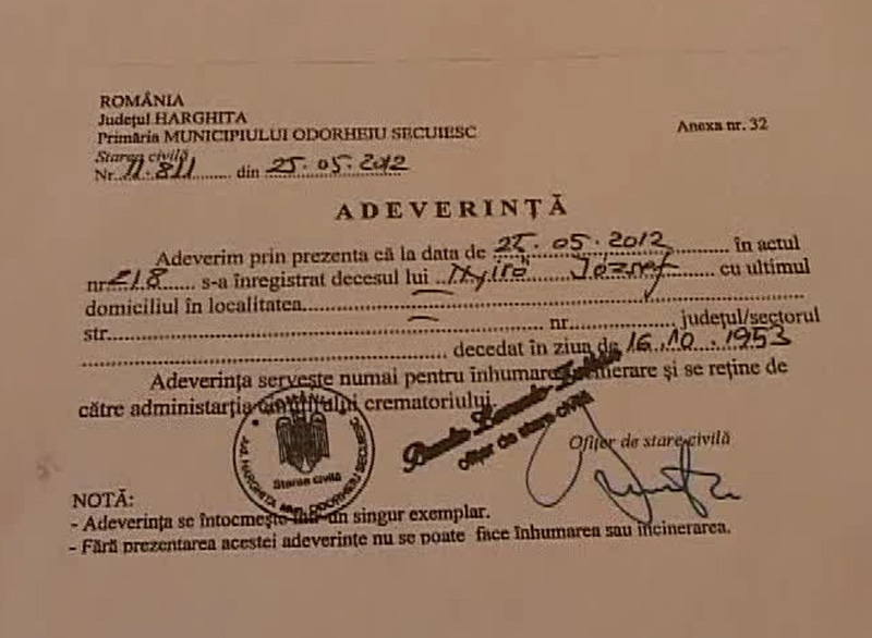 Înhumarea rămăşiţelor nazistului, revizionistului şi antisemitului Nyiro Jozsef e anunţată pentru sărbătoarea (catolică) de Rusalii, beneficiind de înaltul patronaj al preşedintelui parlamentului maghiar, Kover Laszlo. Ambasadorul Ungariei la Bucuresti, Fuzes Oszkar Laszlo, urma să aştepte cortegiul funerar la Gheorghieni (Harghita), iar soţia sa, Bajtai Erzsebet, să însoţească trenul funerar chiar de la intrarea acestuia pe teritoriul României. Autorităţile române îşi fac cu prisosinţă datoria şi-şi anunţă dezacordul cu această intenţie. De aici începe o sarabandă de şmecherii menite să dribleze fireasca vigilenţă a părţii române. Se mimează o înhumare privată, ca într-o replică a mereu actualului Caragiale: ”Curat anticonstituţional, dar înhumaţi-l”. Parlamentul maghiar solicită o adeverinţă de înhumare. Numai că se invocă un act din 2012 (nr. 218) ca dovadă a decesului şi nu documentul real (nr. 642/1953, eliberat la Madrid). Drept urmare, prefectul de Harghita, Augusta Cristina Urzică a atacat în contencios adeverinţa eliberată de primăria Odorheiu Secuiesc. Ca atare, înhumarea a fost suspendată. Dar maghiarii nu se lasă. Afirmă că nu se mai aduc osemintele lui NyiroJozsef, ci cenuşa sa. Jurnalistul Lukacs Csaba apare cu o urnă care, până la urmă, se dovedeşte a fi goală. Luat la întrebări, răspunde ceva de genul „sunt un colecţionar liber de urne goale”. Cert e că înhumarea nu a mai avut loc. Dar o slujbă de comemorare tot s-a făcut. Asta ca să nu ne depărtăm prea mult de „Cronica unei morţi anunţate” a lui Gabriel Garcia Marquez, care chiar este un scriitor uriaş.